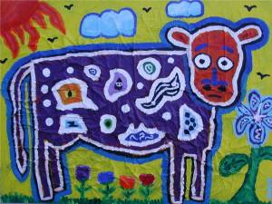 If I was a cow, I’d be pretty worried too. As you can see, this is a pretty goofy painting. Still have it-it’s huge, acrylic on paper bags on canvas.